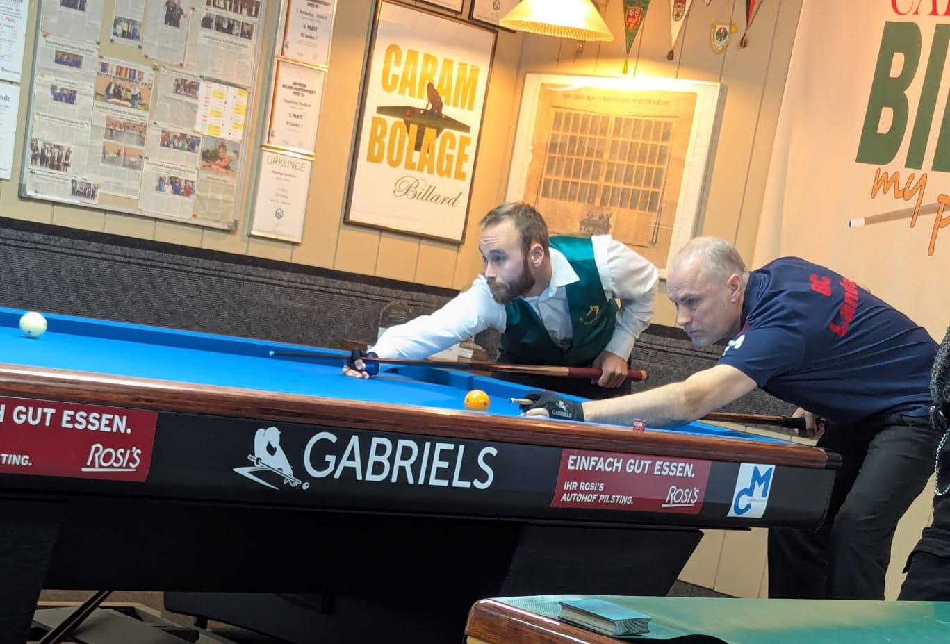 Adam Kozak fand sich nach ausgeglichenem Beginn (11:14 in 15, 18:18 in 20, 20:23 in 25) gegen Christian Bichler mit 25:31 (34 A.) im Rückstand. Der junge Tscheche holte auf zum 37:37 und beendete nervenstark mit 3 zum 40:37 in 43 Aufnahmen.
